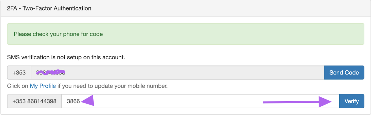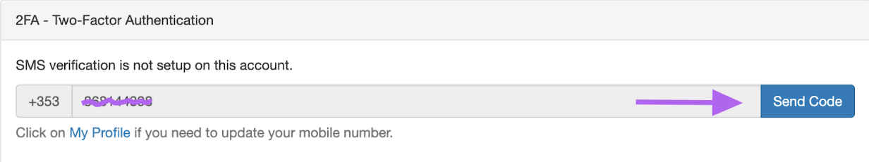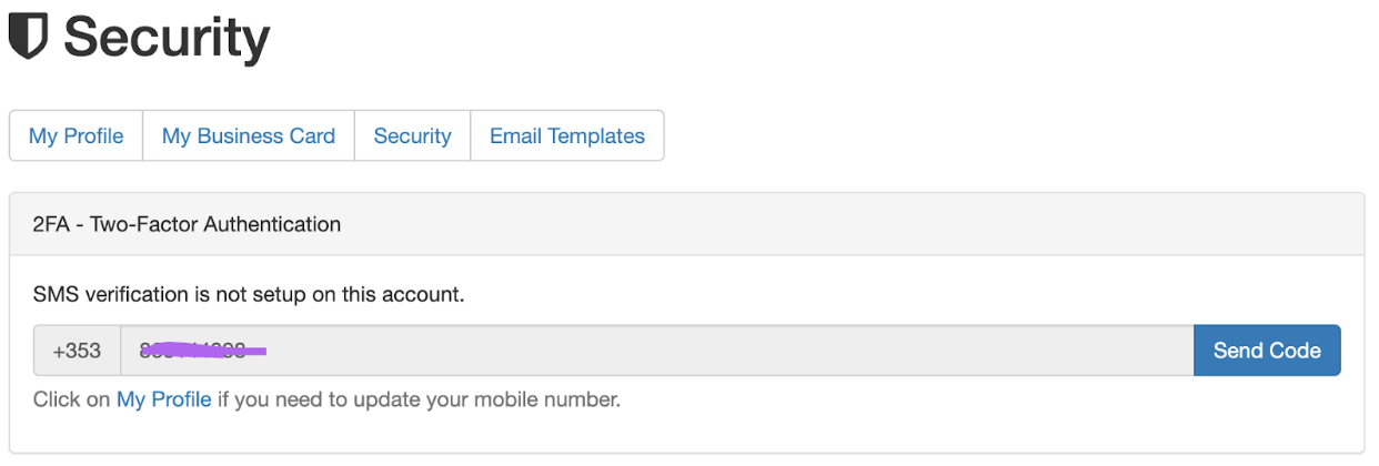 Select the correct country code and enter your mobile number, and click the Update Profile button. When done go back to the Security tab.